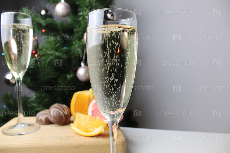 Новогодний натюрморт с шампанским в бокале на фоне зеленой елки и цитрусовых апельсинов и грейпфрутов на подносе из дерева. Атмосфера новогоднего праздника