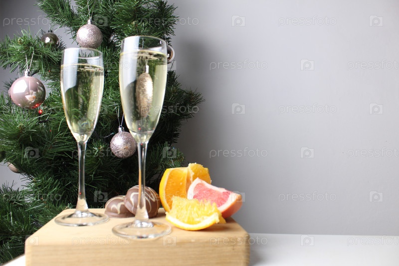 Новогодний натюрморт с двумя бокалами шампанского и фруктами на фоне украшенной елки на сером фоне с местом для вставки текста copyspace