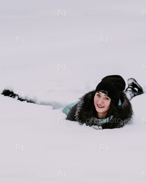 Красивая молодая девушка лежит зимой на снегу