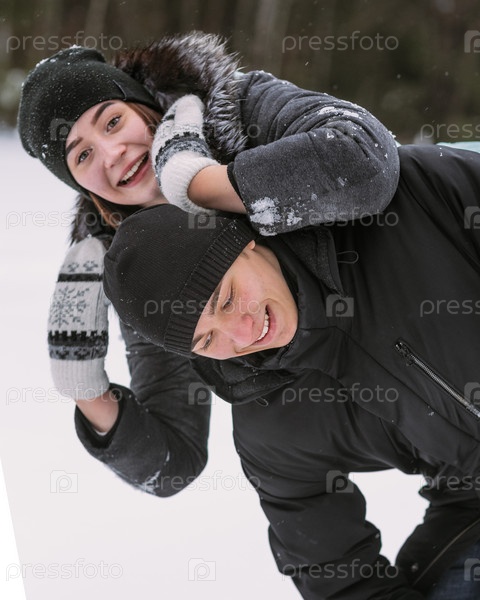 Счастливая пара подростков, весело играющих в снегу в зимнем лесу