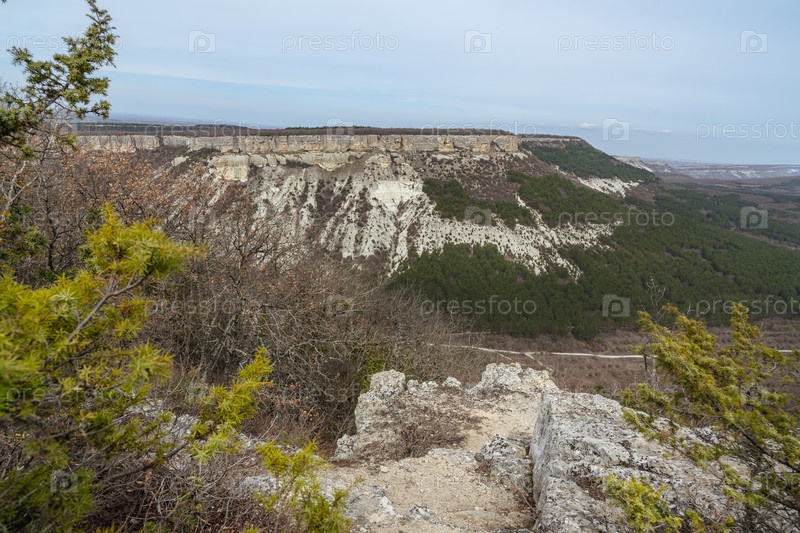 Вид на долину и гору Беш-Кош с плато Бурунчак возле пещерного городка Чуфут-Кале весной. Бахчисарай, Крым