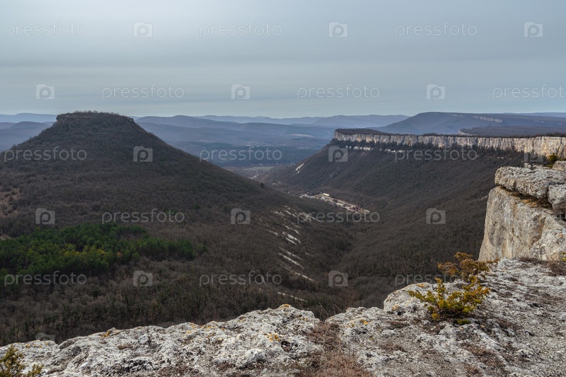 Вид с Бешик-Тау на священную гору караимов весной. Бахчисарай, Крым