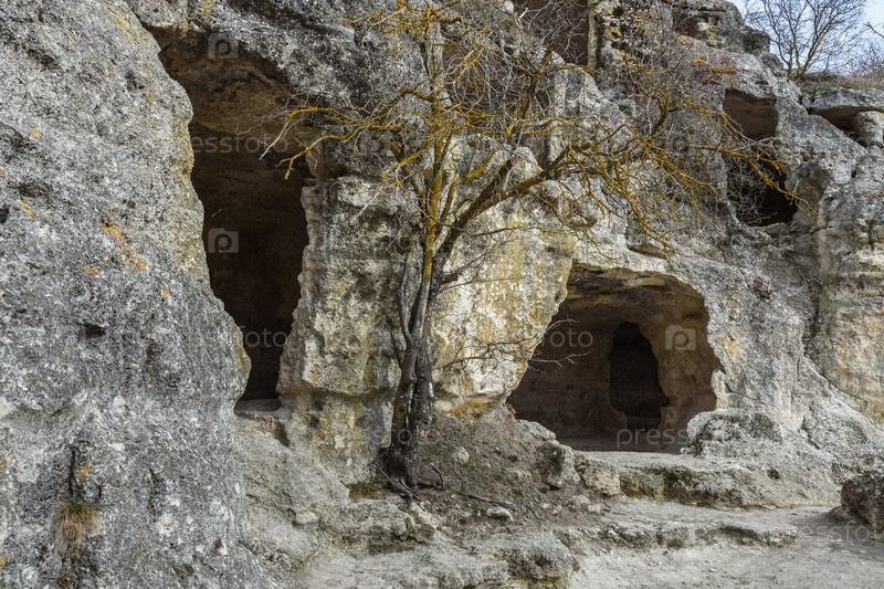 Пещеры в скале Пещерный город Чуфут-Кале в Бахчисарае, Крым