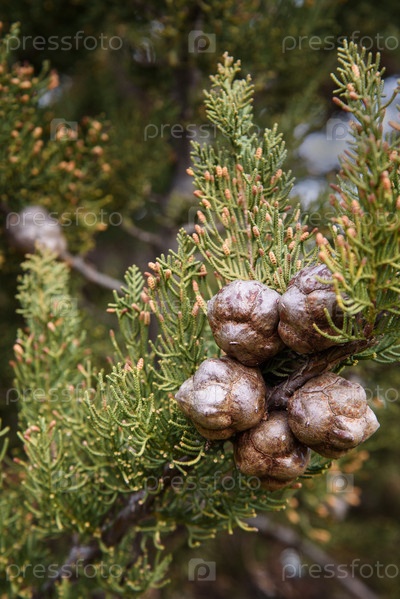 Ветка туи с шишками весной