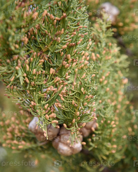 Ветка туи с шишками весной