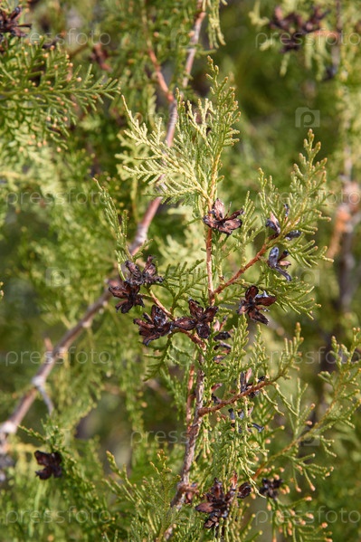 Ветка туи с шишками весной