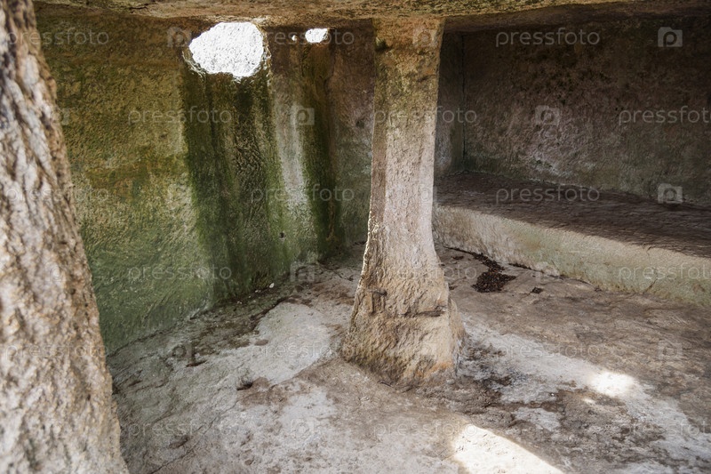 Внутри пещерной комнаты в пещерном городе Чуфут-Кале в Бахчисарае весной, Крым