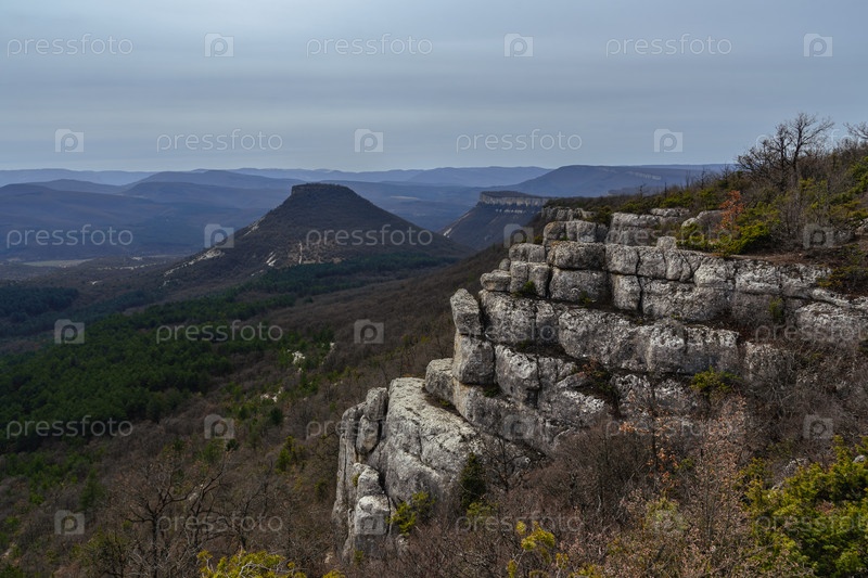 Вид с Бешик-Тау на священную гору караимов весной. Бахчисарай, Крым