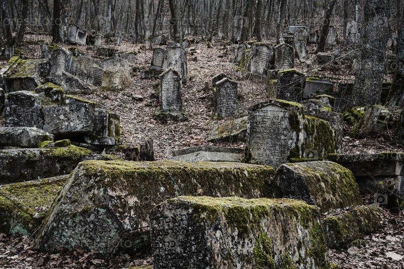 Бахчисарай, Крым - 13 марта 2021 г.: Надгробия на древнем караимском кладбище Балта-Тиймез