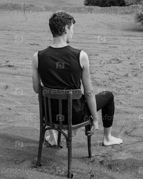 Одинокий мужчина сидит на стуле в пустыне. черное и белое