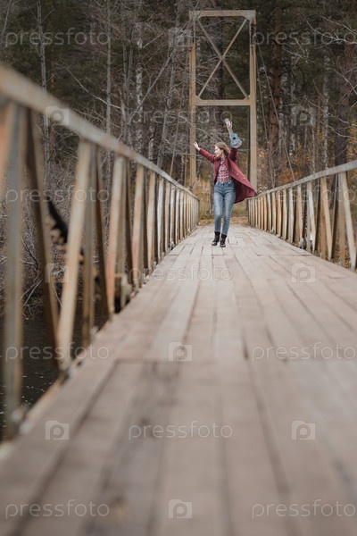 Молодая женщина любит класть голову на забор в мосту на мосту в осеннем лесу