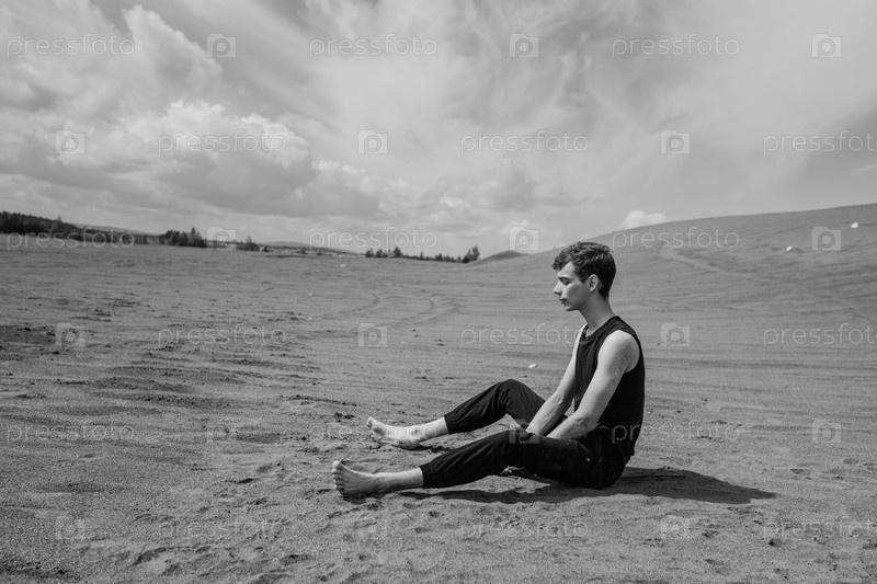 Одинокий мужчина сидит в пустыне. черное и белое