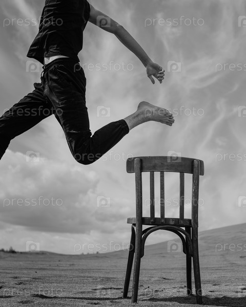 Одинокий мужчина сидит на стуле в пустыне. черное и белое