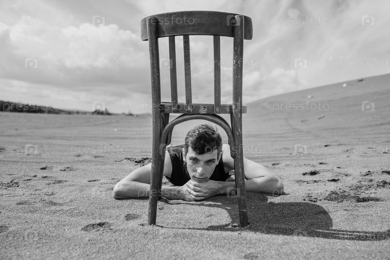 Одинокий мужчина сидит на стуле в пустыне. черное и белое