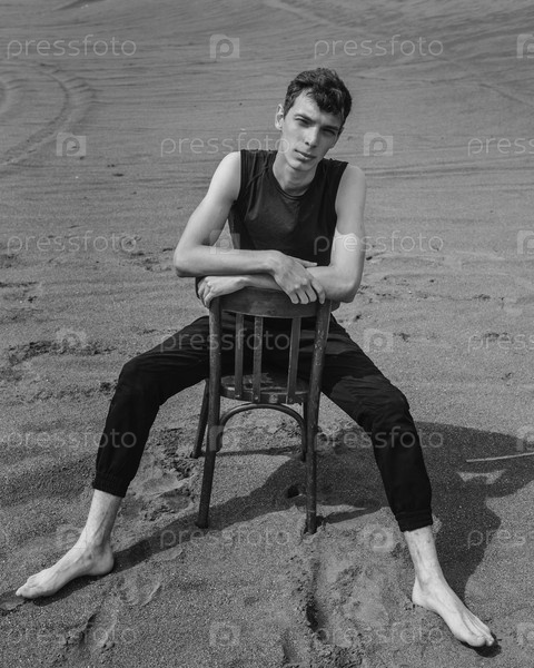 Одинокий мужчина сидит на стуле в пустыне. черное и белое