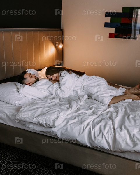 Счастливая молодая пара сидит утром в постели и завтракает в отеле