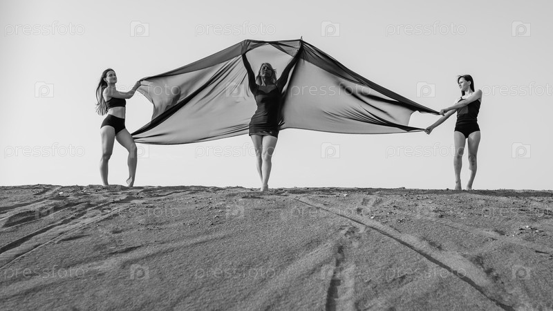 Три девушки с прозрачной тканью на вершине песчаной дюны. Черное и белое