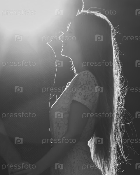 Портрет молодой романтической пары, целующейся в солнечных лучах. Черное и белое