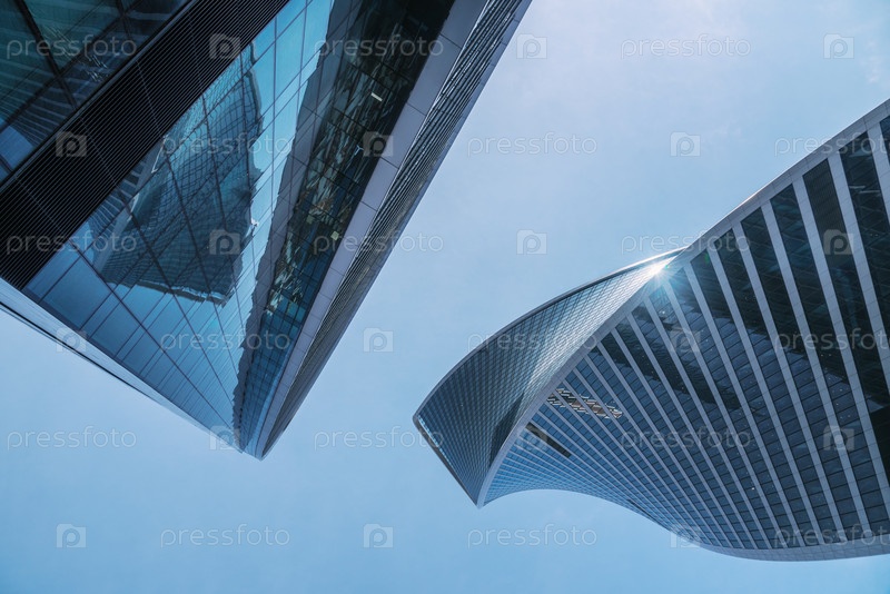 Небоскребы в деловом районе Москва-Сити. Вид на башни снизу вверх. Москва. Россия