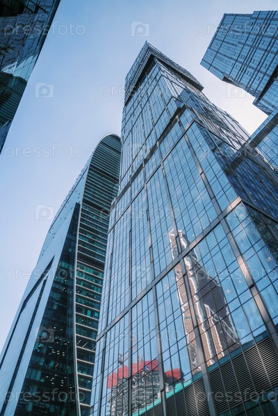 Вид вверх на небоскребы города столиц в деловом центре Москва-Сити на синем фоне. Москва. Россия