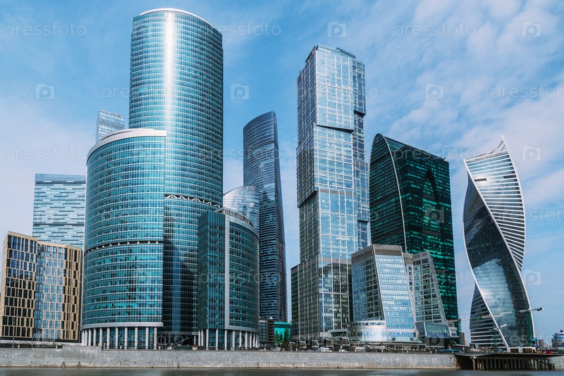 Вид на небоскребы района Москва-Сити в солнечный весенний день. Москва. Россия