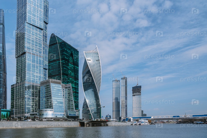 Вид на небоскребы района Москва-Сити и пешеходный мост Багратион через реку в солнечный день. Москва. Россия