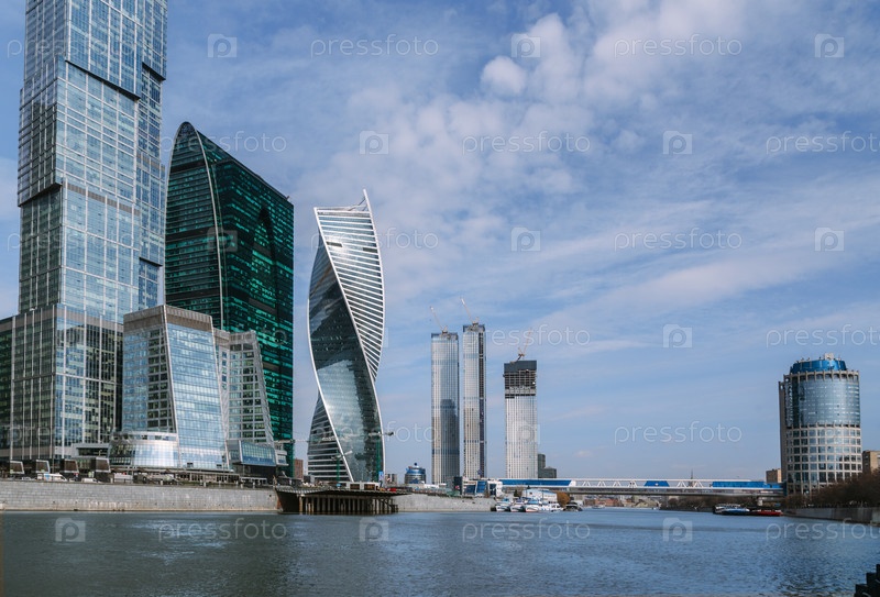 Вид на небоскребы района Москва-Сити и пешеходный мост Багратион через реку в солнечный день. Москва. Россия