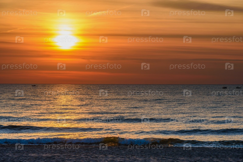 Эффектный яркий золотой закат над Балтийским морем на песчаном пляже