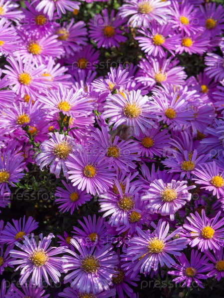 Крупный план красивых фиолетовых цветов астры в саду, цветковый фон. Астра думозовая (Symphyotrichum dumosum, Astra кустыстая). Цветы японской астры или Kalimeris incisa