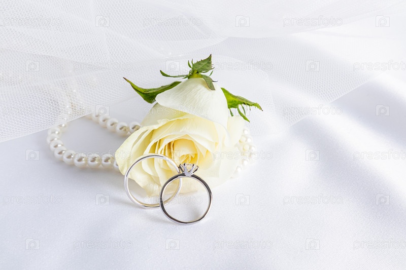 Два обручальных кольца с бриллиантом на фоне свежей чайной розы и жемчужных бусин. Мягкая атласная ткань. место для текста. дизайн макета
