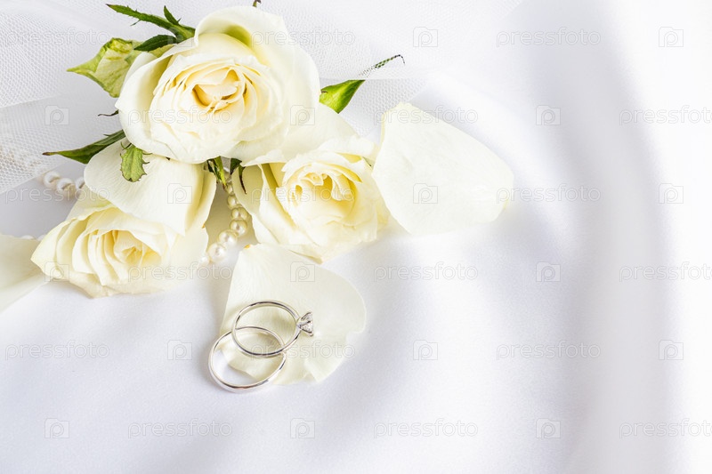 Два красивых обручальных кольца с бриллиантами из белого золота лежат на лепестке чайного листа на пастельном фоне со свежими цветами. Копия пространства