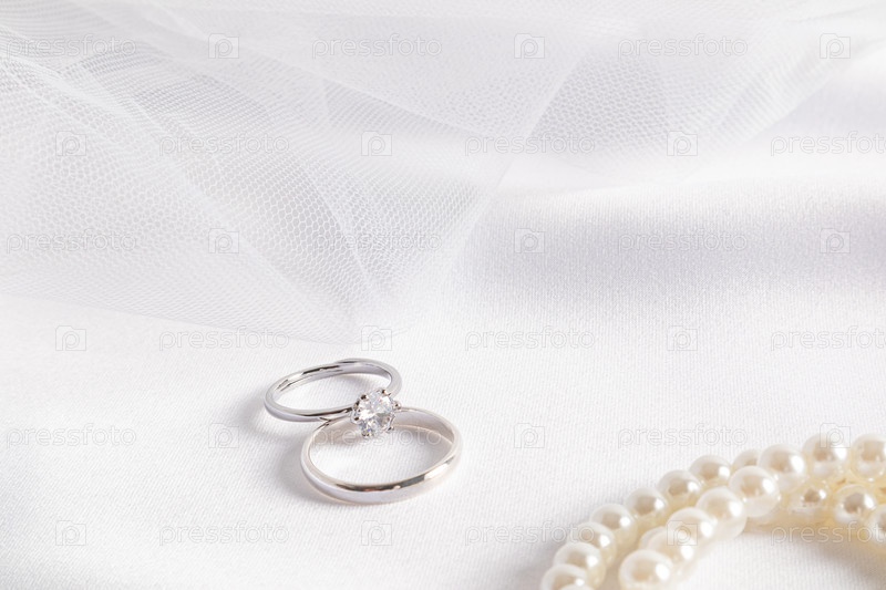 Красивая свадебная композиция для оформления свадебного приглашения, альбома. Два кольца из белого золота с бриллиантами на шикарном белом атласе с вуалью