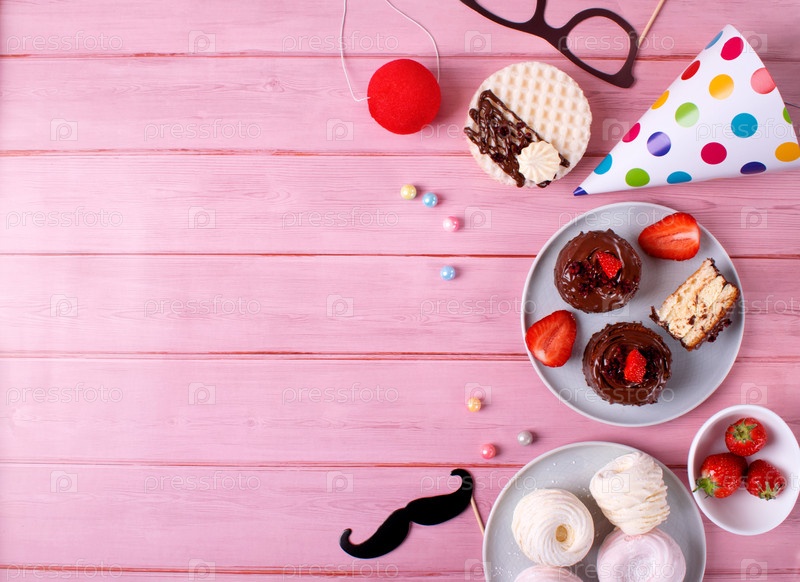 Квартира для вечеринок с десертами и атрибутами для празднования дня рождения или детской вечеринки на розовом фоне. Макет с копией пространства