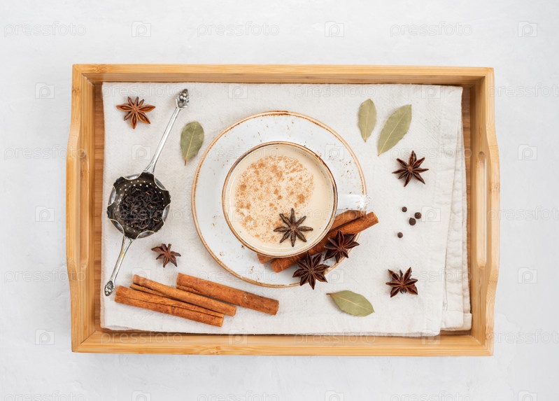 Индийский чай масала. Традиционный индийский горячий напиток с молоком и специями в деревянном подносе на белом бетонном фоне