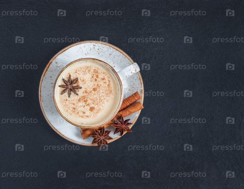 Индийский чай масала. Традиционный индийский горячий напиток с молоком и специями на фоне темного каменного стола. Вид сверху, плоская планировка. Копировать пространство