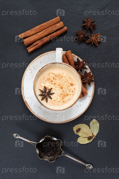 Индийский чай масала. Традиционный индийский горячий напиток с молоком и специями на фоне темного каменного стола. Вид сверху, плоская планировка