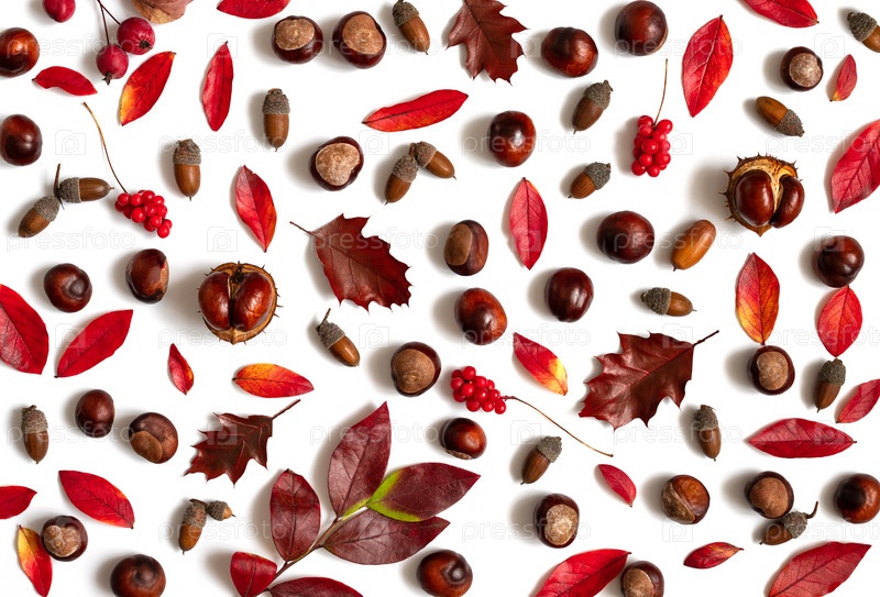 Осенний узор с листьями, каштанами, желудями и ягодами на белом фоне. Красивая осенняя композиция. Вид сверху, плоская планировка