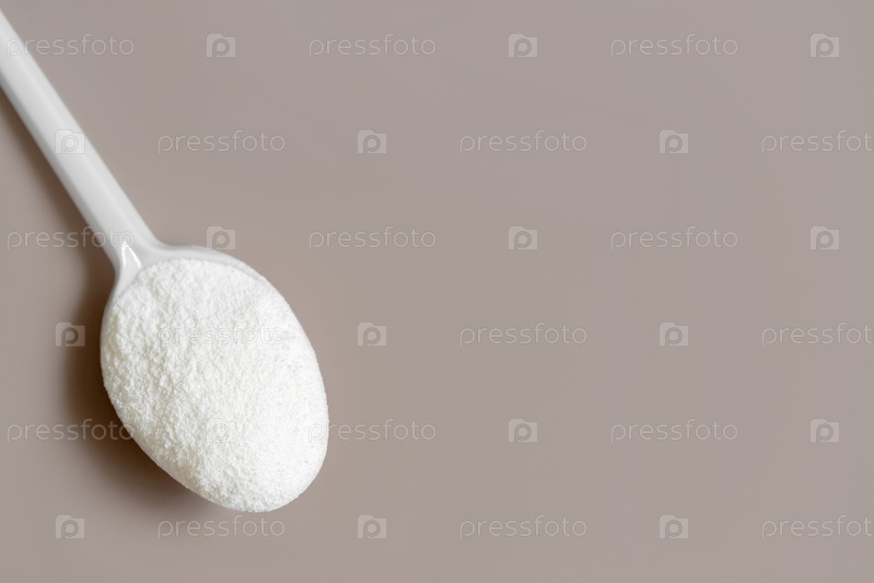 Коллаген крупным планом на бежевом фоне. Белковый порошок коллагена в белой ложке. Натуральная добавка для красоты и здоровья. Скопируйте пространство, вид сверху, плоская планировка