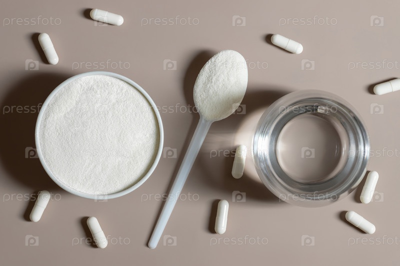 Коллагеновый порошок, таблетки и стакан воды на бежевом фоне крупным планом. Потребление белка. Натуральная здоровая добавка. Вид сверху, плоская планировка