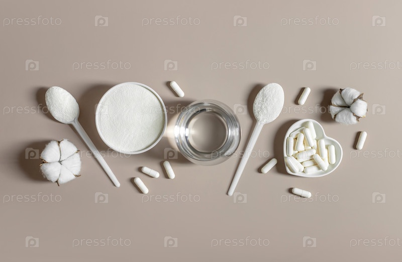 Коллагеновый порошок и таблетки на бежевом фоне. Коллагеновая добавка на растительной или рыбной основе. Концепция здорового образа жизни. Вид сверху. Место для текста