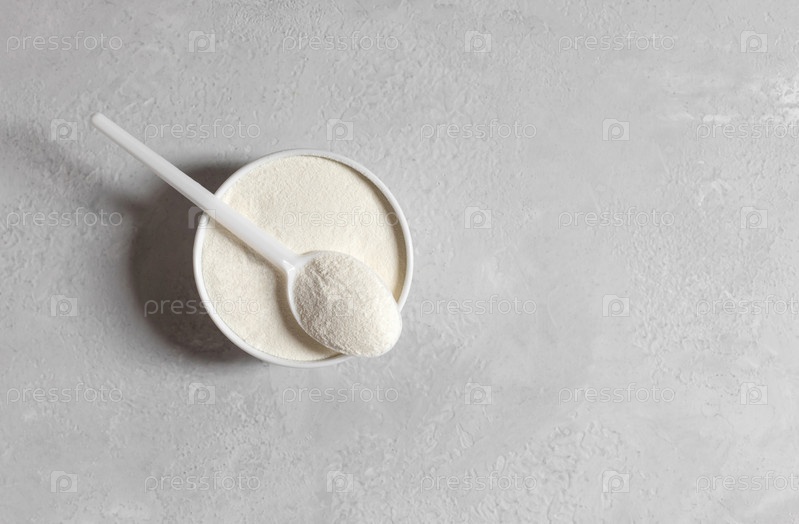 Коллагеновый порошок с миской на сером фоне. Натуральная добавка для здоровья костей и суставов. Антивозрастная добавка для кожи. Скопируйте пространство, вид сверху