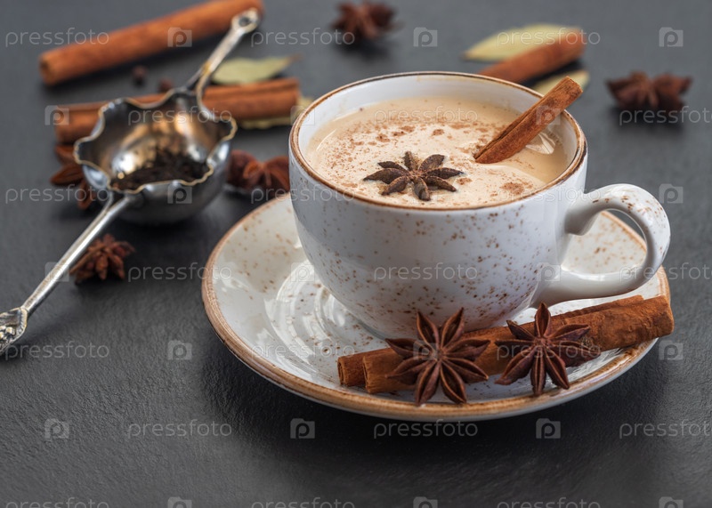 Индийский чай масала. Традиционный индийский горячий напиток с молоком и специями на фоне темного камня крупным планом