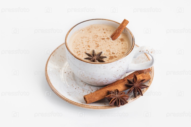 Индийский чай масала. Традиционный индийский горячий напиток с молоком и специями на белом фоне крупным планом