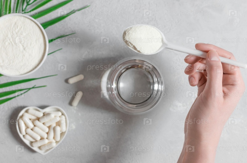 Женская рука насыпает порошок коллагена или белок в стакан воды на сером фоне. Натуральная добавка для красоты и здоровья. Вид сверху