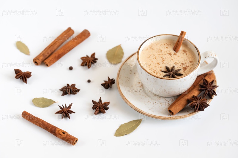 Индийский чай масала. Традиционный индийский горячий напиток с молоком и специями на белом фоне крупным планом