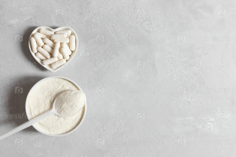 Коллагеновый порошок и таблетки на сером фоне. Протеиновый порошок гидролизованного коллагена. здоровая добавка. Скопируйте пространство, вид сверху
