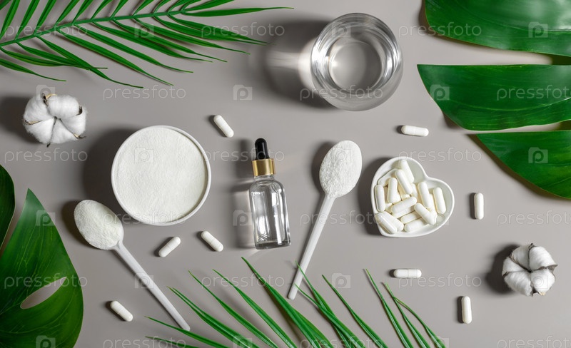 Набор коллагена на сером фоне с листьями. Коллагеновый порошок, капсулы и жидкий коллаген. Натуральная добавка для красоты кожи и здоровья костей. Вид сверху