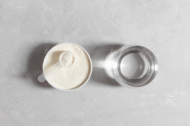 Коллагеновый порошок в миске, мерная ложка и стакан воды на сером фоне. Концепция здорового образа жизни. Вид сверху, плоская планировка