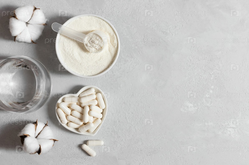 Коллагеновый порошок и таблетки на сером фоне. Коллагеновая добавка для красоты и здоровья. Скопируйте пространство, вид сверху