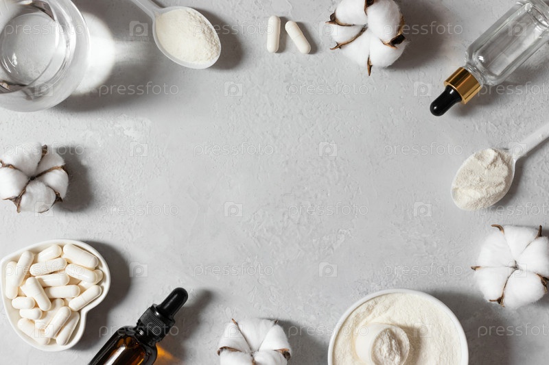 Набор коллагена. Коллагеновый порошок, таблетки и жидкий концентрат на сером фоне. Добавка для здоровья и красоты. Скопируйте пространство, вид сверху, плоская планировка